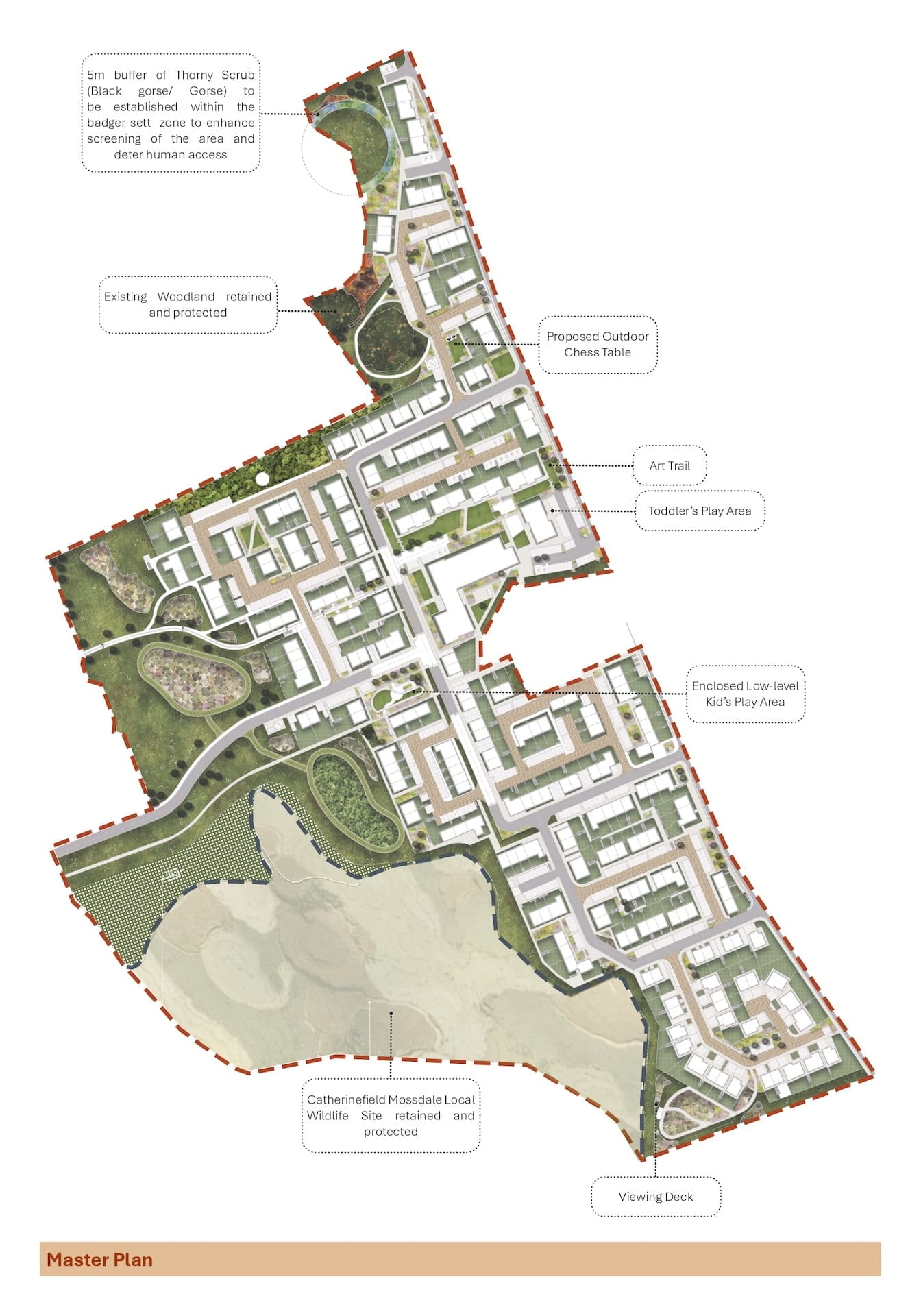 The landscape treatment links the rural setting to the housing with robust planting, whilst protecting the environmentally sensitive Catherinefield Moss Local Wildlife Site.
